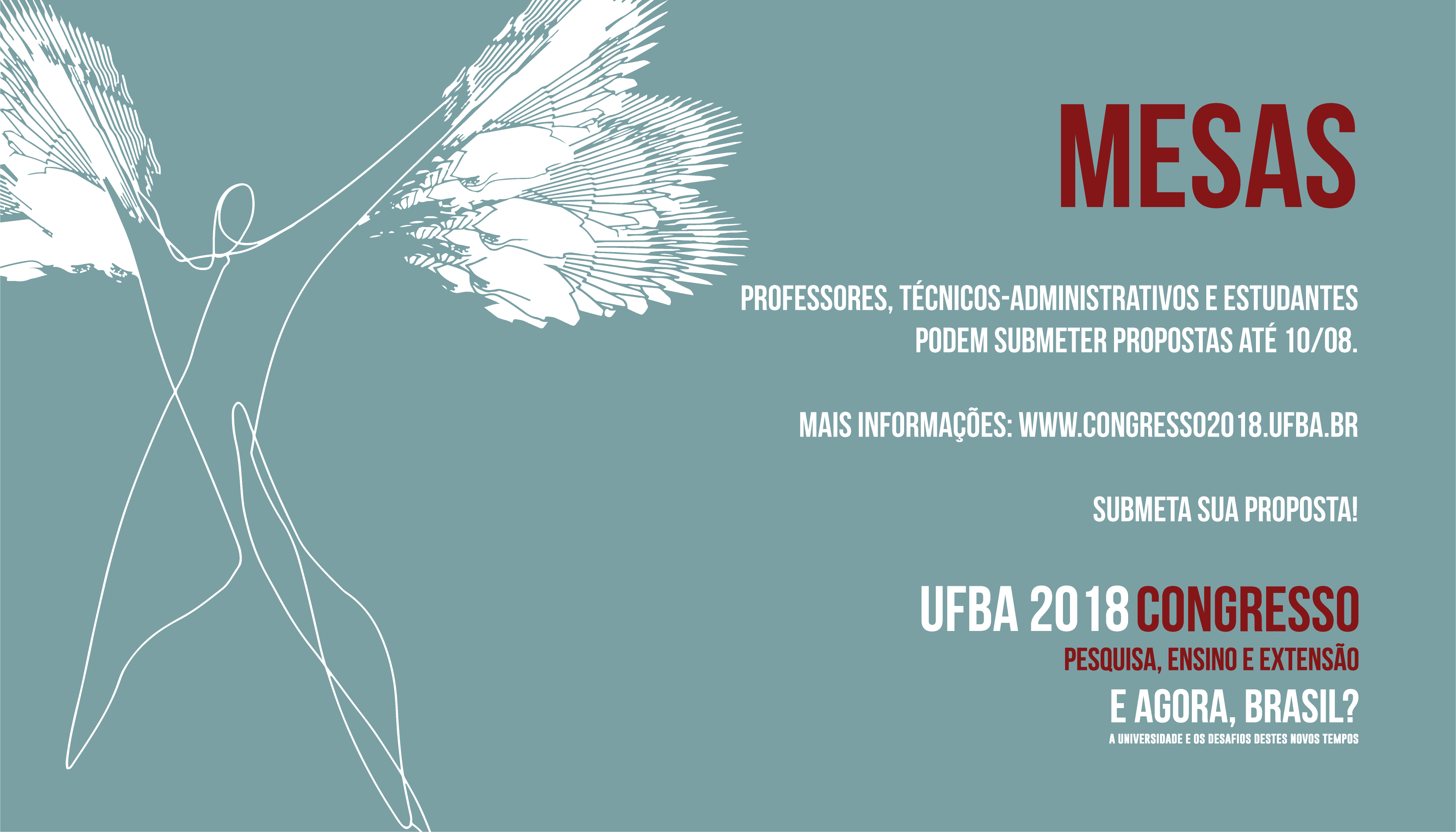 Está aberto até o dia 10 de agosto o prazo para a inscrição de Mesas Temáticas para o Congresso da UFBA 2018. Toda a comunidade universitária - professores, alunos e servidores técnicos - pode submeter suas propostas preenchendo o formulário disponível no site oficial do Congresso www.congresso2018.ufba.br.