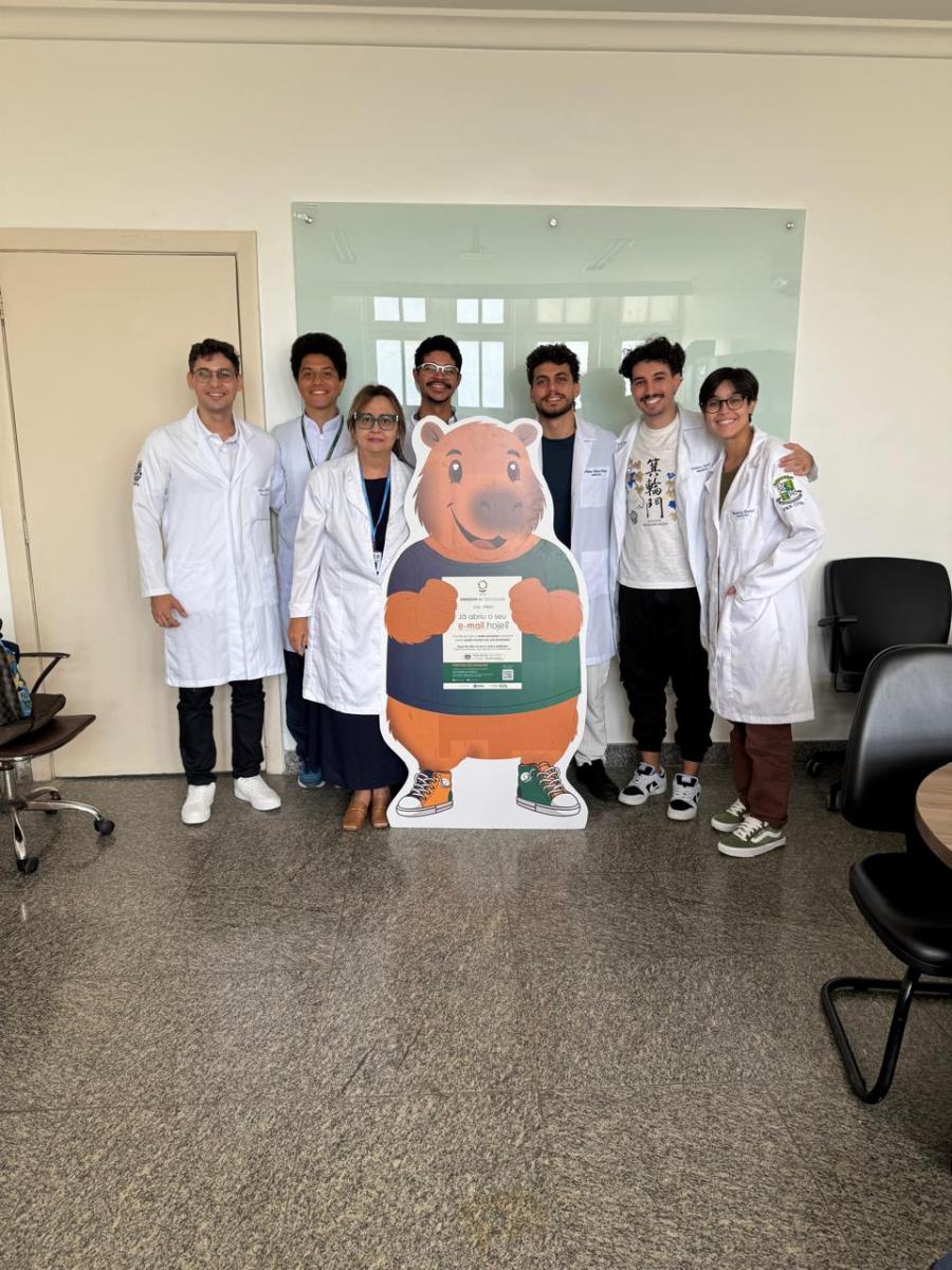 Foto: A mascote da pesquisa, Rene, rodeada pela coordenadora do estudo na UFBA, Ângela Scippa, e estudantes da graduação em Medicina