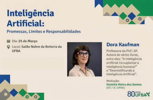 A atividade que será ministrada pela professora Dora Kaufman e mediada por Vaninha Vieira dos Santos (Superintendente de Tecnologia da Informação da UFBA), tem como proposta apresentar fundamentos centrais da inteligência artificial, além de promover uma reflexão crítica sobre seus impactos, limites e responsabilidades na sociedade contemporânea e no ambiente universitário.