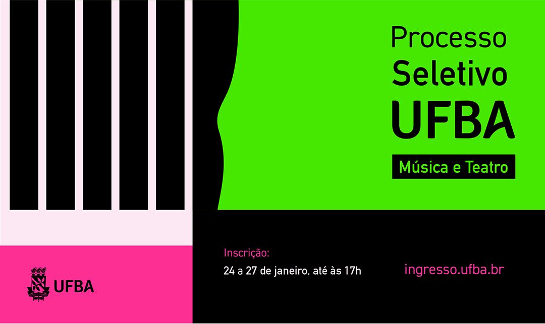 O processo seletivo para os cursos de Música e Teatro da UFBA recebe inscrições no período de 24, a partir de 9h, a 27 de janeiro, até às 17h, no endereço: https://www.ingresso.ufba.br/processo-seletivo-musica-teatro