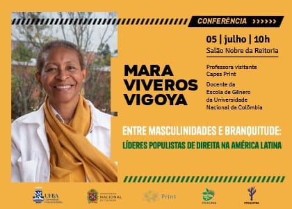 Mara Viveros Vigoya - professora titular e cofundadora da Escola de Estudos de Gênero da Universidade Nacional da Colômbia - está na UFBA como professora visitante de curta duração do Programa de Pós-Graduação em Antropologia, da Faculdade de Filosofia e Ciências Humanas (FFCH), por meio do Programa Capes-Print.