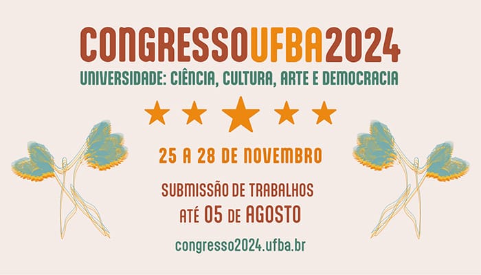 De 25 a 28 de novembro de 2024, a Universidade Federal da Bahia será o palco do Congresso de Pesquisa, Ensino e Extensão: o Congresso UFBA. A nona edição do evento abrigará, mais uma vez, reflexões, debates, comunicações e apresentações artísticas, que contemplam a tríade de ensino, pesquisa e extensão e reafirmam o papel da instituição na produção e disseminação da ciência, no fortalecimento da cultura e na defesa da democracia. O período de submissões de trabalhos segue aberto até 05 de agosto. Acesse: congresso2024.ufba.br