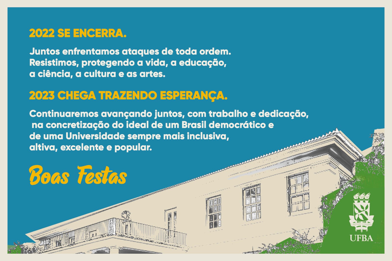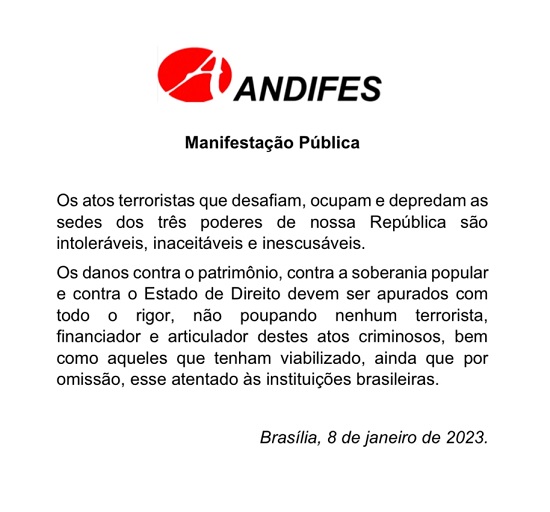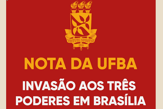 A Universidade Federal da Bahia acompanha com perplexidade e indignação a invasão dos edifícios dos Três Poderes da República Federativa do Brasil e exorta as autoridades competentes a investigar, responsabilizar e punir os responsáveis, direta e indiretamente, pelo cenário de caos instaurado em Brasília neste domingo, 08 de janeiro de 2023.
