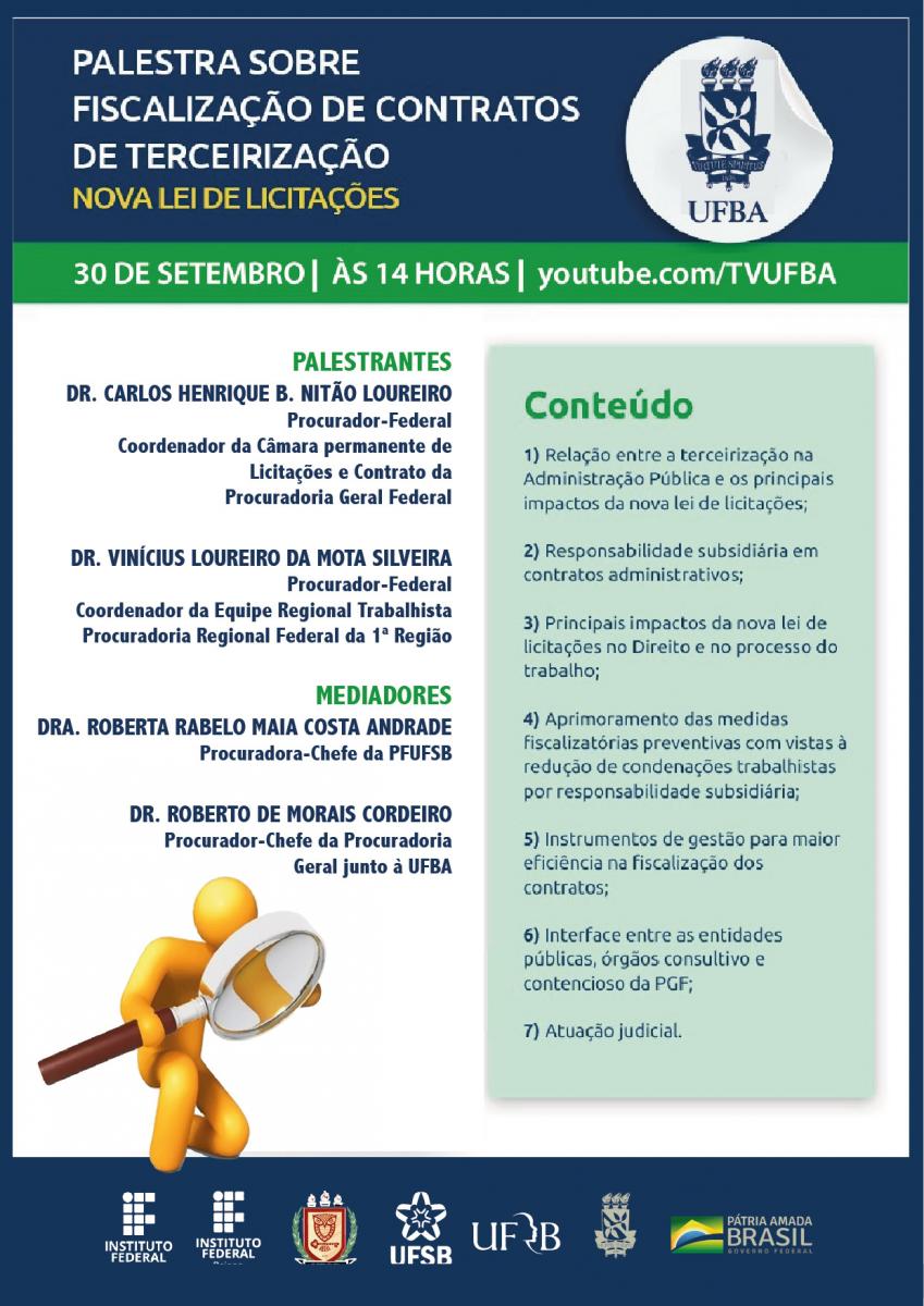A Procuradoria-Geral junto à UFBA está promovendo na próxima quinta-feira, dia 30 de setembro, às 14 horas, a Palestra Sobre Fiscalização de Contratos de Terceirização – Nova Lei de Licitações.
