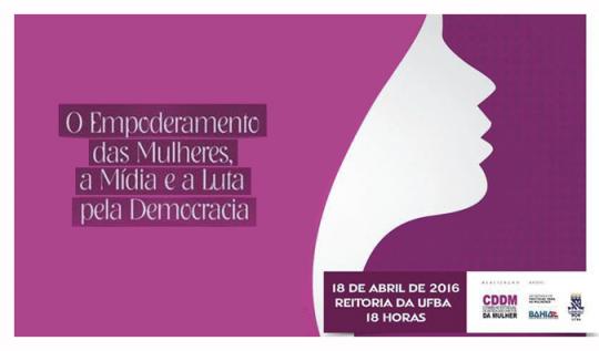 Na próxima segunda-feira (18/04), às 18h, a Reitoria da Universidade Federal da Bahia, será palco do debate “O empoderamento das Mulheres, a Mídia e a Luta pela Democracia”. A atividade que é aberta ao público, será coordenada pela Pró-Reitora de Ações Afirmativas e Assistência Estudantil da UFBA, Cássia Virgínia Maciel, e conta com o apoio da Secretaria Estadual de Políticas para as Mulheres da Bahia (SPM-BA), terá a participação de juristas, jornalistas, mulheres que exercem cargos públicos e ativistas dos movimentos sociais com o objetivo de analisar a crise nacional, o estado democrático e de direito, tendo foco nas manifestações de machismo e misoginia que têm ganhado expressão nos meios de comunicação e no debate político.