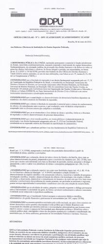 A Universidade Federal da Bahia recebeu o Ofício nº 001/2016/OFDHTC RJ da Defensoria Pública da União, reiterando o direito fundamental da instituição à liberdade de expressão e ao exercício da autonomia didático-científica, assegurando à sua comunidade a livre iniciativa na promoção e participação em atividades que se relacionem ao debate em torno da atual configuração política nacional, sem o cerceamento de seus direitos. O mesmo documento também foi enviado aos reitores e diretores de todas as instituições de ensino superior do país.
