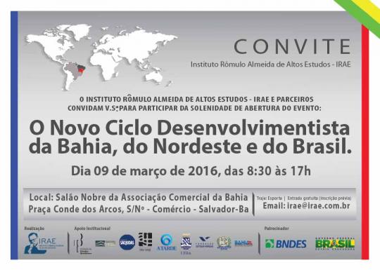Acontece no próximo dia 09/03, das 08 às 17 horas, o evento que terá como tema "O novo ciclo desenvolvimentista da Bahia, do Nordeste e do Brasil", promovido pelo Instituto Rômulo Almeida de Altos Estudos (IRAE) com o apoio da Universidade Federal da Bahia. O evento será realizado no Salão Nobre da Associação Comercial da Bahia – localizada na Praça Condé dos Arcos, s/n - Comercio, Salvador – BA.