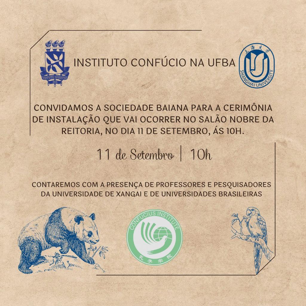 No dia 11 de setembro, às 10 horas, no Salão Nobre da Reitoria, será realizada a instalação do Instituto Confúcio (IC) na Universidade Federal da Bahia, que foi viabilizado através de acordo assinado entre a UFBA e a Universidade de Xangai – uma das principais da China. A iniciativa tem como objetivo promover o ensino da língua e cultura chinesas, estimular o intercâmbio de estudantes e professores e o desenvolvimento de pesquisas e projetos conjuntos entre os países.