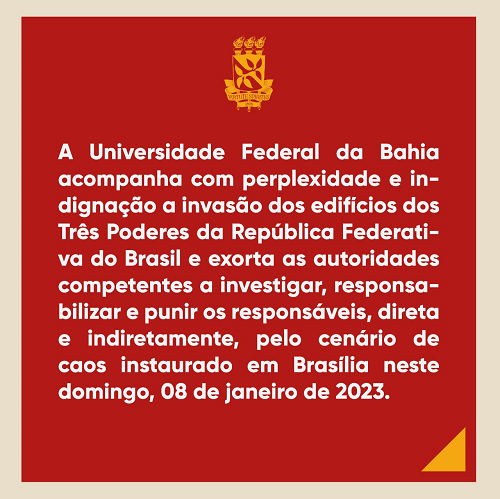 A Universidade Federal da Bahia acompanha com perplexidade e indignação a invasão dos edifícios dos Três Poderes da República Federativa do Brasil e exorta as autoridades competentes a investigar, responsabilizar e punir os responsáveis, direta e indiretamente, pelo cenário de caos instaurado em Brasília neste domingo, 08 de janeiro de 2023.