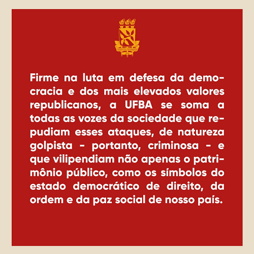 Firme na luta em defesa da democracia e dos mais elevados valores republicanos, a UFBA se soma a todas as vozes da sociedade que repudiam esses ataques, de natureza golpista - portanto, criminosa - e que vilipendiam não apenas o patrimônio público, como os símbolos do estado democrático de direito, da ordem e da paz social de nosso país.