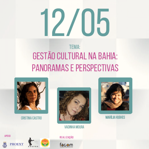 Estão confirmadas as presenças das gestoras Cristina Castro, gestora e idealizadora do festival Vivadança; Marília Hughes, diretora da empresa Coisa de Cinema e produtora do festival Panorama Internacional Coisa de Cinema; e Vadinha Moura, produtora cultural, gestora de espaços culturais e diretora do Teatro Módulo. O debate terá a mediação da pesquisadora Gisele Nussbaumer, professora do Curso de Produção Cultural e do Programa Multidisciplinar de Pós-Graduação em Cultura e Sociedade/PÓS-CULTURA e membro do Centro de Estudos Multidisciplinares em Cultura/CULT da UFBA.