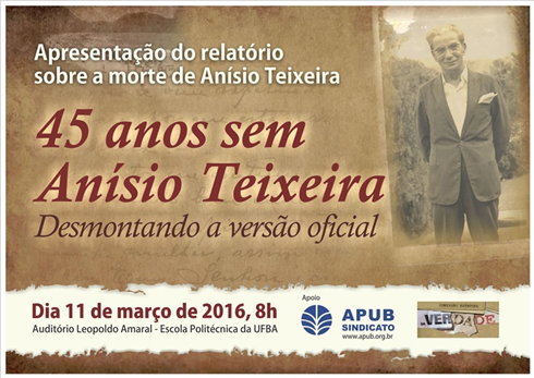 No dia 11/03, às 8 horas, será realizado um evento em homenagem ao educador Anísio Teixeira, com o objetivo também de trazer a público novas informações sobre as causas de sua morte, ainda envolta em dúvidas e questionamentos. Promovido pelo APUB – Sindicato dos Professores das Instituições Federais de Ensino Superior, o evento será realizado no auditório Leopoldo Amaral da Escola Politécnica da UFBA, na Federação.